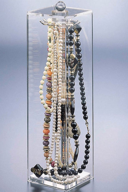 The Hanging Necklace Holder is a great way to store, organize and protect a collection of bracelets and necklaces. This jewelry organizer is made entirely of crystal clear acrylic that stands up to years of use. The design features a removable lid with easy-to-grip knob that attaches to 12 hooks – the knob allows easy access to contents when pulled up out of bottom unit. The necklace holder is a great jewelry box for the home, or necklace display case for a jeweler. Keep favorite jewelry pieces safe from tangling and collecting dust with the Acrylic necklace Holder.