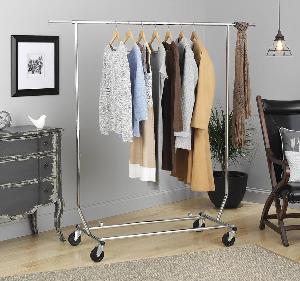 The heavy duty, commercial grade garment rack features tubular steel construction and commercial casters for easy mobility. The rack provides over six feet of hanging space, and expands in both height and width. The height of this garment rack can be adjusted between 66 and 71 inches, while extenders provide more hanging space each end of the rod letting you adjust the width from 51 inches to 74.5 inches with ease. When you don’t need the garment rack anymore, you can fold it down and slide it under a bed. The folded dimensions of this clothes rack are 52 x 22.25 x 3.5 inches.