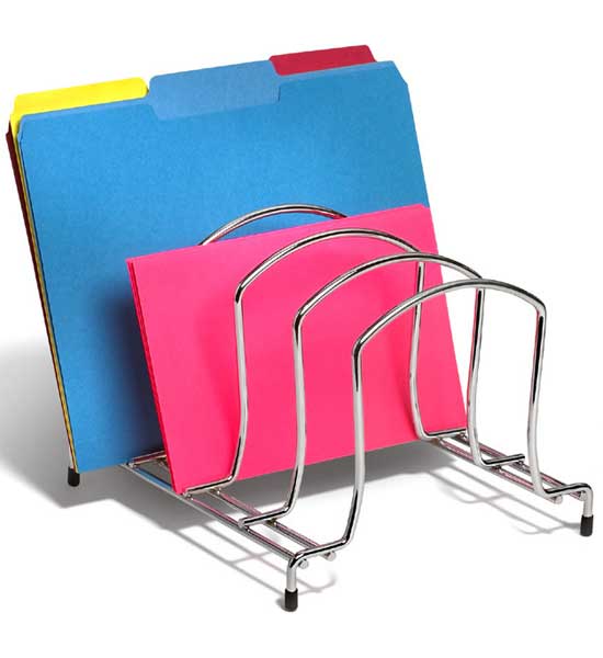 The simple design makes this Wire Pan and Lid Organizer useful in any room. This multi-purpose wire organizer can be used to declutter kitchen cabinets, and will hold platters, baking sheets, muffin tins, cutting boards, and more. Set it on your desk, and you’ve got a handy file holder! Made of heavy-duty metal with a chrome finish, this organizer is easy to clean and rust-resistant. Four generously sized sections store your bakeware or files. Each section provides 2-1/4 inches of space. This organizer also features vinyl feet to protect surfaces.
