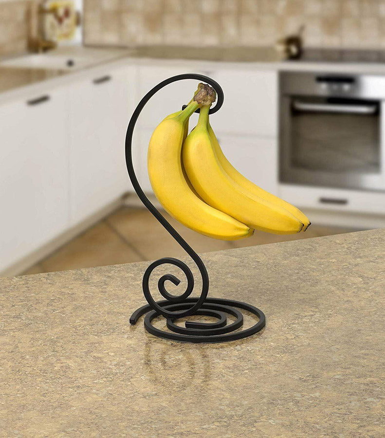 The Scroll Black Iron Banana Tree is a funky and practical kitchen organizer that is great for helping your fruit ripen and remain fresher longer, keeping your countertops neat and organized, and adding a contemporary touch to any decor.